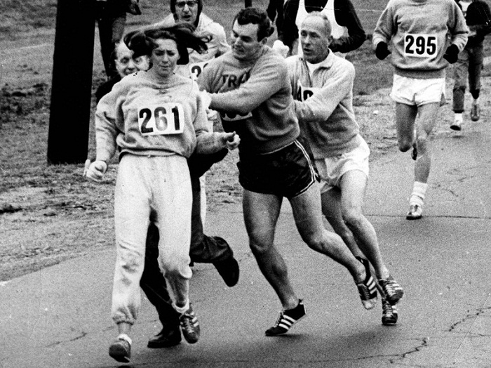 فكان من غير المسموح للنساء الجري في ماراثون بوسطن حتى عام 1972. وفي عام 1966 كانت روبيرتا بوبي جيب أول امرأة تكمل السباق. وتلتها كاترينا سويتزر والتي سجلت باسم آخر اعتُقد أنه لرجل. وحين دخلت السباق تفاجأ الجميع، وحاولوا إخراجها.