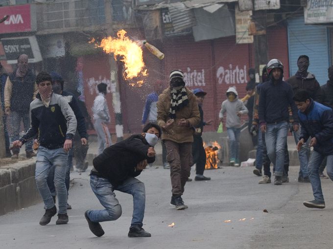02 يناير 2016 – كشمير الهندية، مسلمون من كشمير يُلقون الحجارة والقنابل الحارقة على الشرطة الهندية خلال احتجاج في سريناجار.