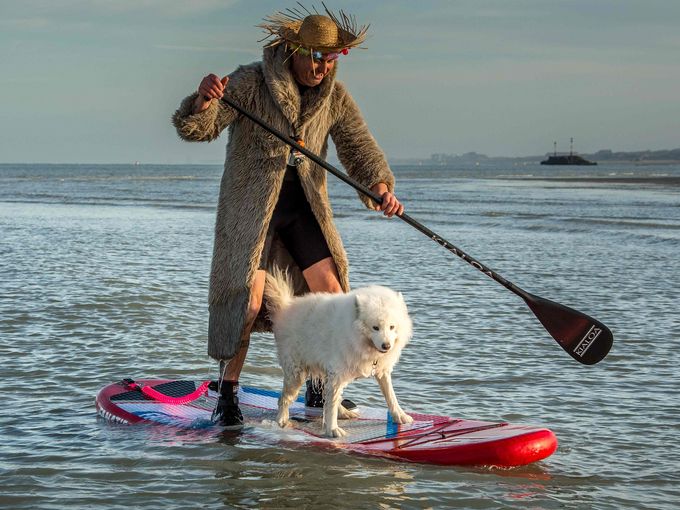 02 يناير 2015 – فرنسا، رجل يُجذف على لوح ركوب الأمواج برفقة كلبه أثناء احتفال الناس بحدث السباحة التقليدي بالأول من العام الجديد.