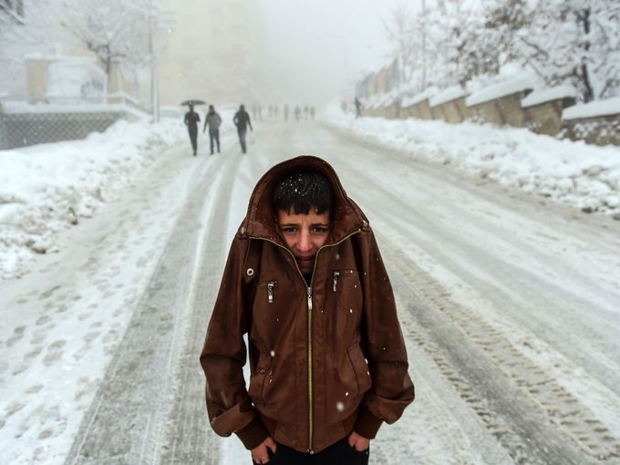 02 يناير 2016 – تركيا، طفل كردي يُخفي رأسه داخل ملابسه للاحتماء من الثلوج والبرد في مدينة سيرناك جنوب شرق تركيا.