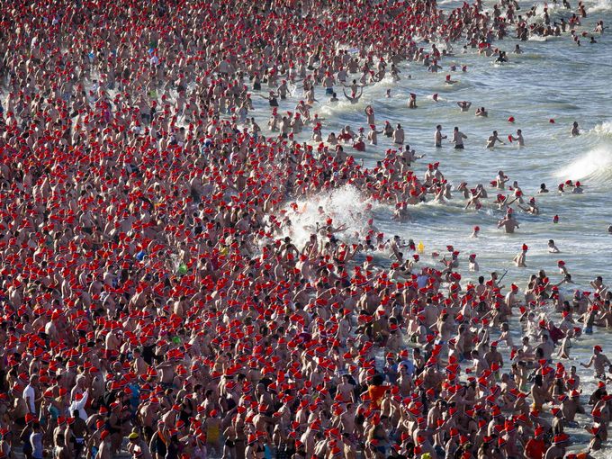 02 يناير 2016 – هولندا، مئات الأشخاص يرتدون قبعات ملونة ويغوصون في مياه شاطئ “سخيفينينغن” كأحد المهرجانات التقليدية لاستقبال السنة الجديدة.